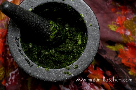 As I was writing this post, I learnt that அப்பா (appah) and அம்மா (ammah) were growing up – they didn’t know what coriander leaves were. They would use the seeds in recipes ( ie. kothamalli thani) but not the leaves.  So for this dish, they would use something called தூதுவளை (thoodhuvalay) or Solanum Tilobatum: a herb used to treat the common cold, cough and asthma (according to wikipedia).