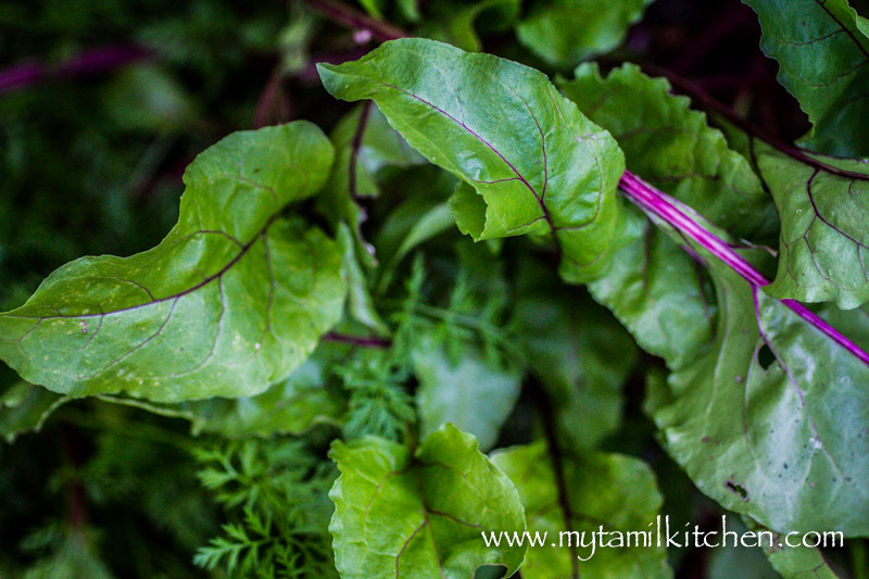 My parents came over yesterday and we picked carrots and beets. Which left me with quite a lot leaves – perfect for something my mum often makes with the greens in her garden – varai.