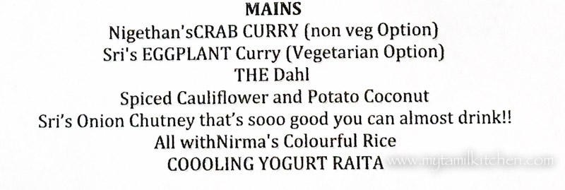 When I arrived at Tamil Feasts, I smiled at the annas, but didn’t want to disturb them. It was a special night – we were being served crab (nandu) curry. I told my dining partners they were in for a treat, remembering how happy my brother and I would be when our ammah’s nandu curry was on the menu. (Tamil Feasts also cater for vegetarians and vegans).